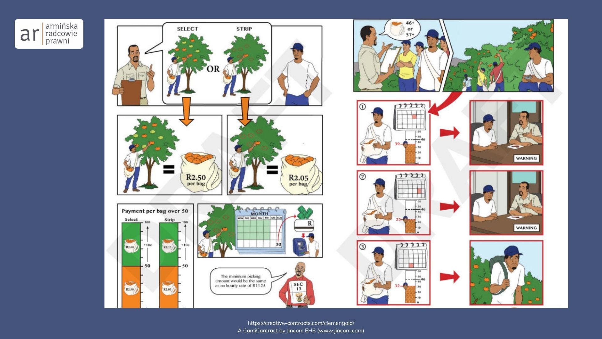 Szeroko omawiany w środowisku jest także tzw. comic contracts autorstwa Roberta de Rooy. Stworzył on umowę dla firmy rolniczej jako komiks. Zauważył bowiem, że RPA, gdzie działała firma, wielu niepiśmiennych pracowników nie rozumiało treści podpisywanej umowy. Przerobił ją więc na komiks, stosując zrozumiałe rysunki i piktogramy. Obrazki do dane do tekstu uczyniły tę umowę zrozumiałą dla pracowników firmy, a jednocześnie ważną prawnie.